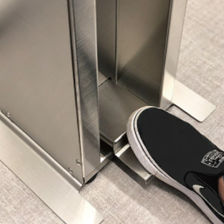 フットペダル式なのでボトルに触れることなく手指の消毒ができます。また素材は耐久性、デザイン性に優れたヘアライン仕上げステンレスを使用しています。